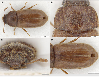 Figura 1. A. Vista dorsal. B. Vista dorsal del pronotum. C. Vista frontal de la caeza. D. Vista dorsal del abdomen.
